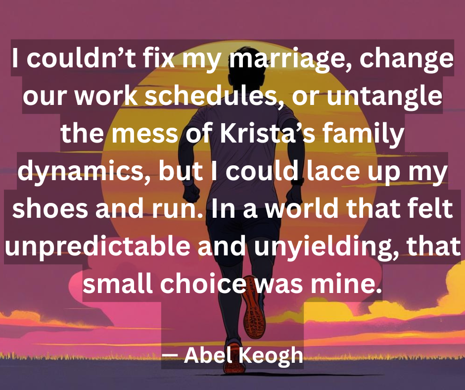 I couldn’t fix my marriage, change our work schedules, or untangle the mess of Krista’s family dynamics, but I could lace up my shoes and run. In a world that felt unpredictable and unyielding, that small choice was mine. I reclaimed part of myself one step and one mile at a time. Somewhere along the way, the soda lost its appeal, and the snacks no longer offered comfort. The weight came off—50 pounds in six months—but what mattered more was the sense of control I began to regain. When everything else felt out of sync, running gave me something solid to hold on to. It became proof that progress, however small, was still possible. For the first time in years, I could point to something and say: this is working. And for a while, that was enough. After I lost the weight, running became more than exercise—it became a ritual, a rhythm, and a refuge. Most of all, it gave me a way to face the things I couldn’t control and clarity to start repairing what I could.